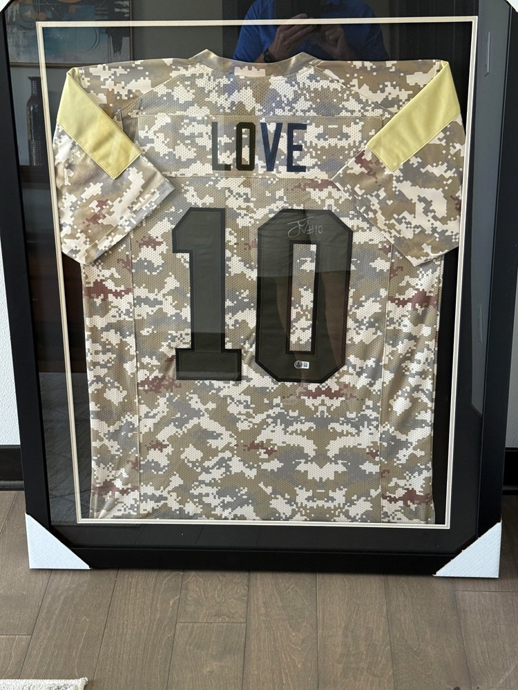 Jordan Love autographed, military tribute jersey! Professionally framed by Jeff's Sports Frame dimensions: 36x44" est. Black with black and almond matting to match camo pattern. **The winning bidder is responsible for paying shipping via UPS/USPS based on zip code prior to the item being shipped if the item will not be picked up in person at the banquet or office in Milwaukee**